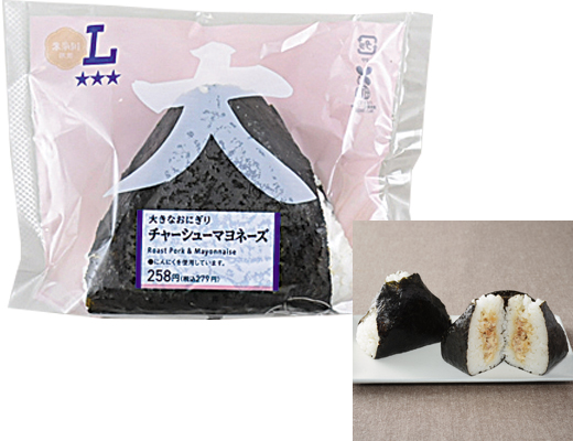 A large onigiri filled with char siu mixed with sweet-salty soy sauce and mayonnaise. Onion adds a flavorful accent!