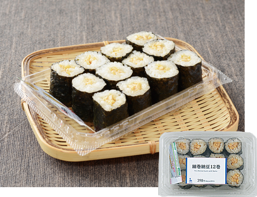 Bite-sized natto maki made with finely minced natto seasoned with Higeta soy sauce for a rich flavor. 12-roll set.