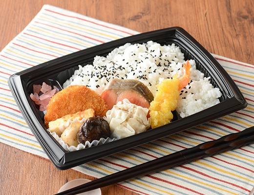 A Makunouchi Bento with a variety of side dishes, including grilled salmon, shrimp tempura, shumai, croquettes, thick Japanese omelette, and simmered dishes. A balanced mix of grilled and fried items makes for a hearty, satisfying meal.