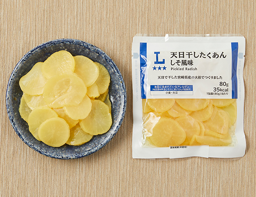 Takuan with a firm, crisp bite made from Miyazaki sun-dried daikon, featuring a balanced, tangy shiso flavor.