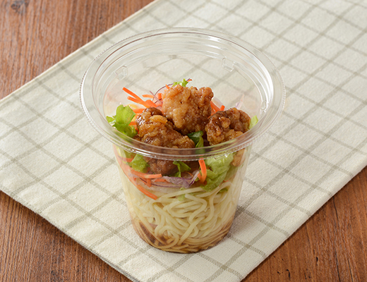 A balanced mix of pasta, vegetables, and meat. An addictive blend of sweet-spicy karaage and mayonnaise.