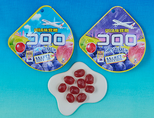 Kororo peach and grape flavors, in collaboration with JAL, featuring its distinctive chewy texture.
