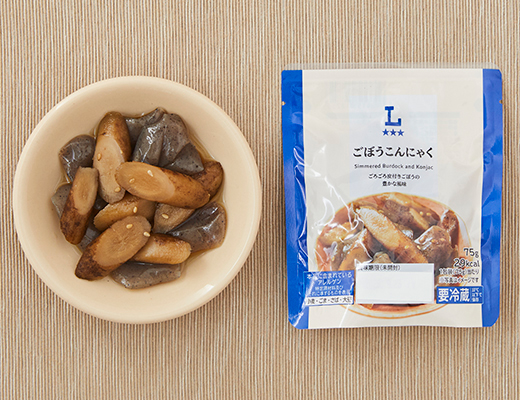 Diagonally sliced burdock and konnyaku simmered in a special bonito-kombu dashi.