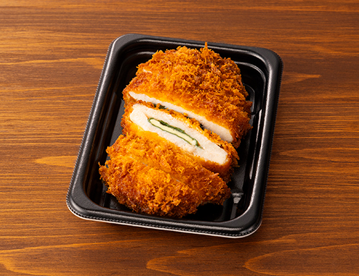 A chicken cutlet with cheese and shiso tucked inside tender chicken breast.