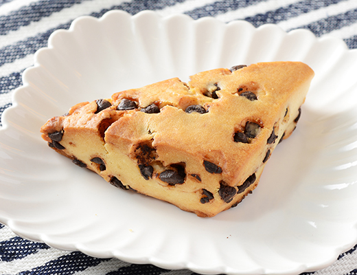 A chocolate chip scone made with Hokkaido cream, featuring a crumbly, melt-in-your-mouth texture.