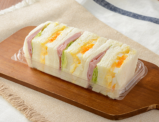 A box sandwich with two varieties: an egg sandwich made with boiled eggs and a lettuce-ham sandwich.