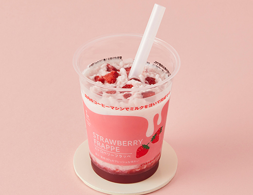 A four-layer frappé finished with milk drawn from a coffee machine, delivering the rich flavor of fresh strawberries.