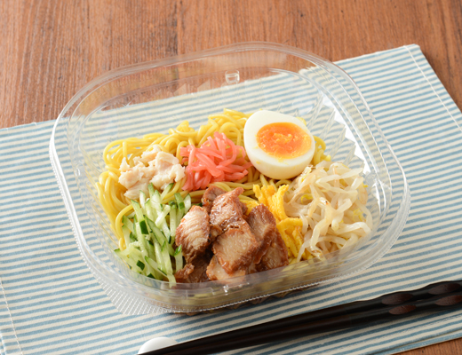 Noodles made with domestically produced wheat flour in a tangy soy sauce broth, topped with roast pork and other ingredients for a refreshing cold Chinese-style noodle dish.