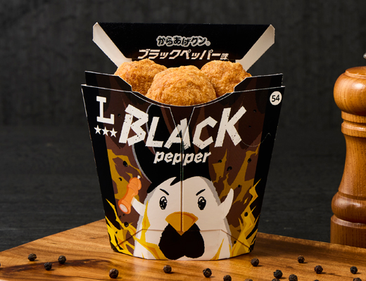 Karaage-kun Black Pepper flavor with a bold, dark look and sharp heat. The spicy taste comes from a blend of pepper paste and spices.