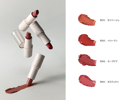 A moisturizing lip color stick that glides on smoothly. Four shades: BE01 Mori Beige / RD01 Berry An / RD02 Mauve Dear / RB01 Dusty Chili.